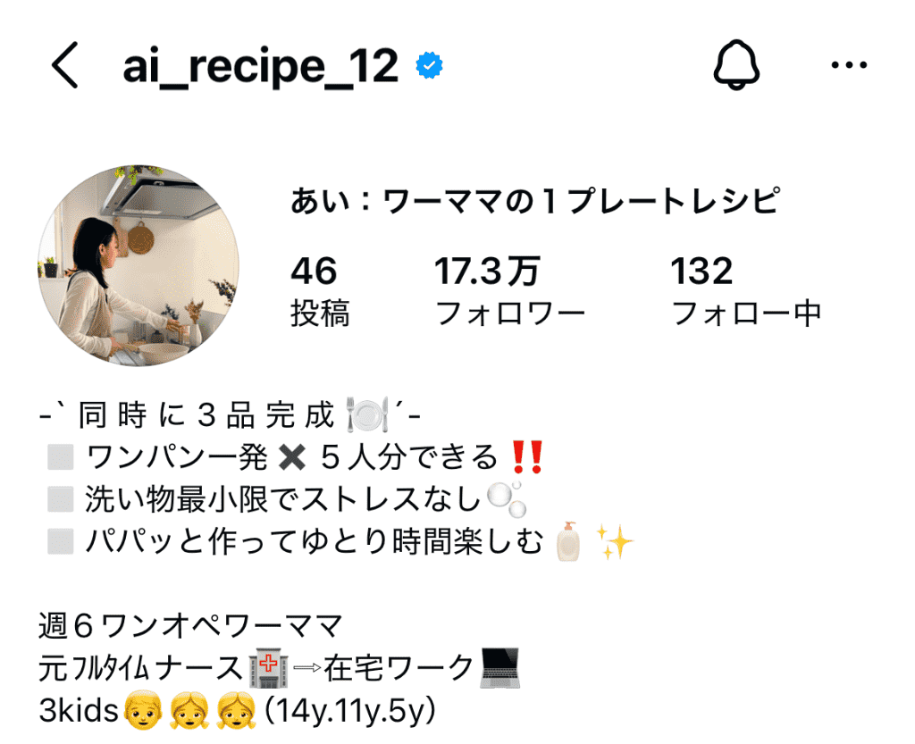 今回ご紹介するのは、10年以上ワンオペ状態で疲れ果てていた生活から一変、インスタグラムをきっかけに自分らしい人生を取り戻した、あいさん(@ai_recipe_12)です。