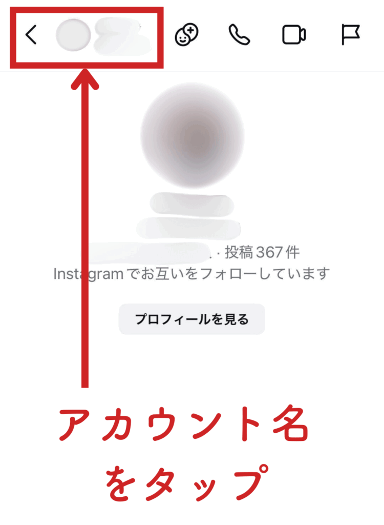 つづいて、メッセージが表示される画面の上部にあるアカウント名をタップしてください。