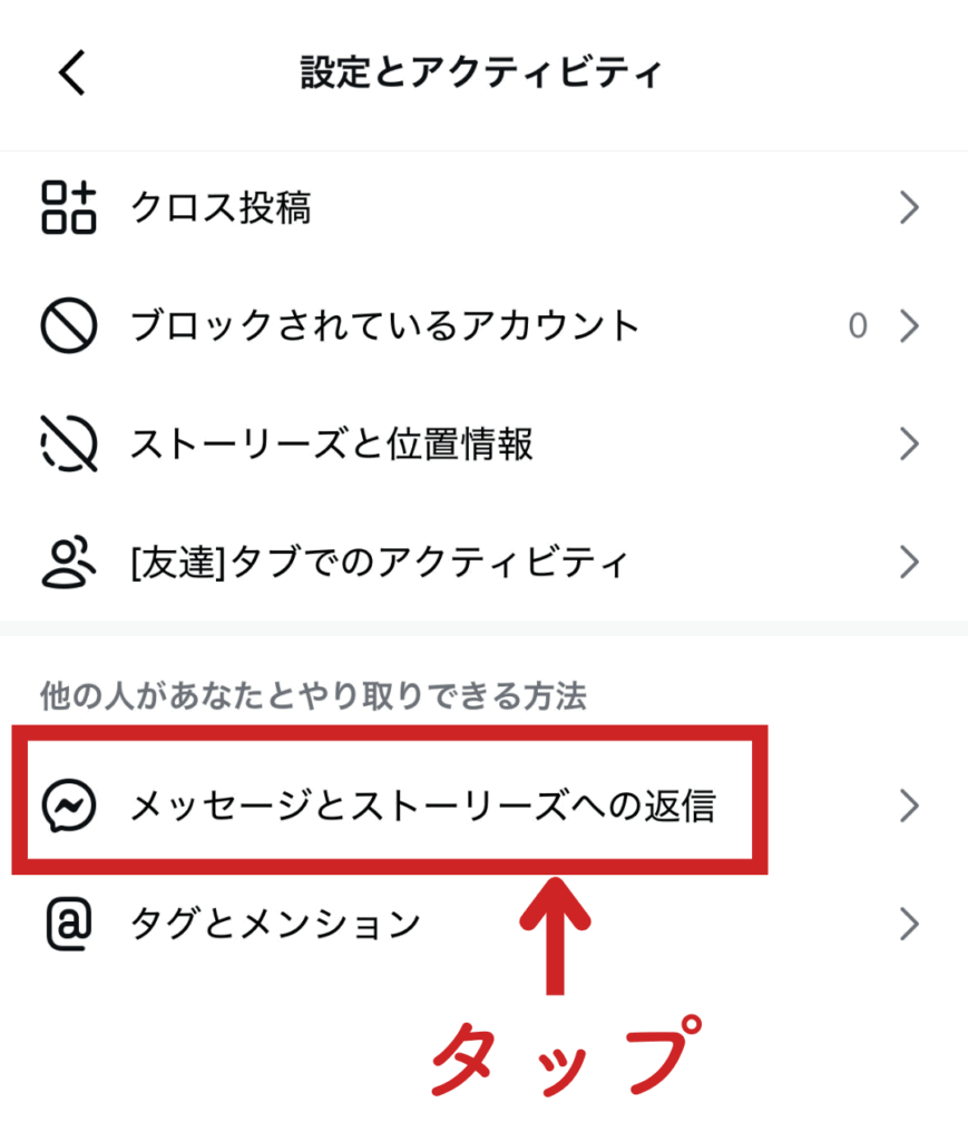 つづいて、メニュー内の「メッセージとストーリーズへの返信」をタップしてください。