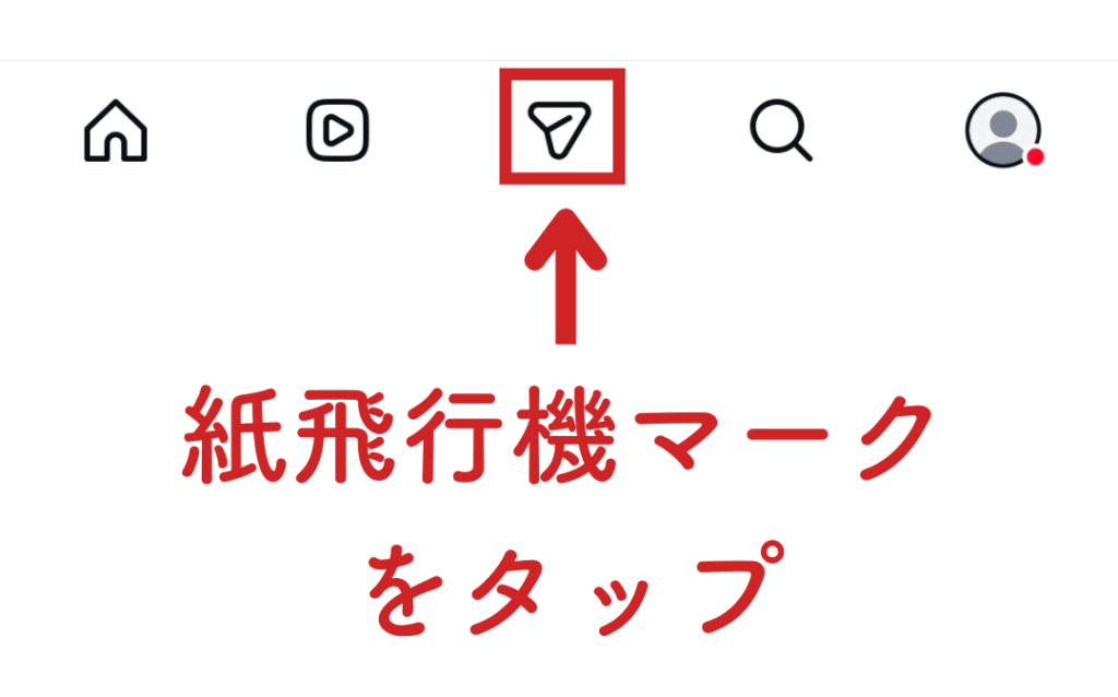 まず、インスタグラムのアプリを開き、画面下の「紙飛行機のマーク」をタップします。