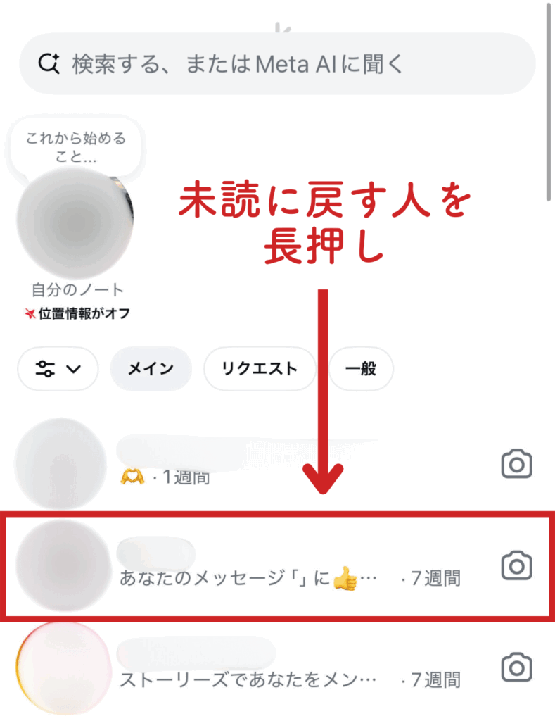 DM一覧画面に切り替わるので、未読に戻したい人を長押ししてください。