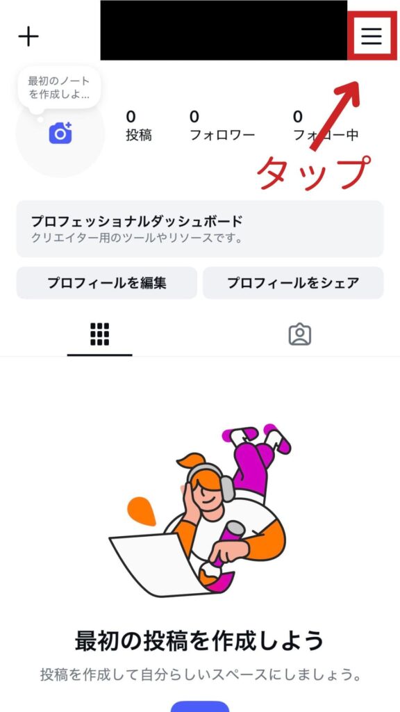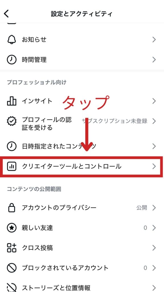 プロフィール画面の右上にある3本線(メニュー)をタップして、「クリエイターツールとコントロール」をタップしてください。